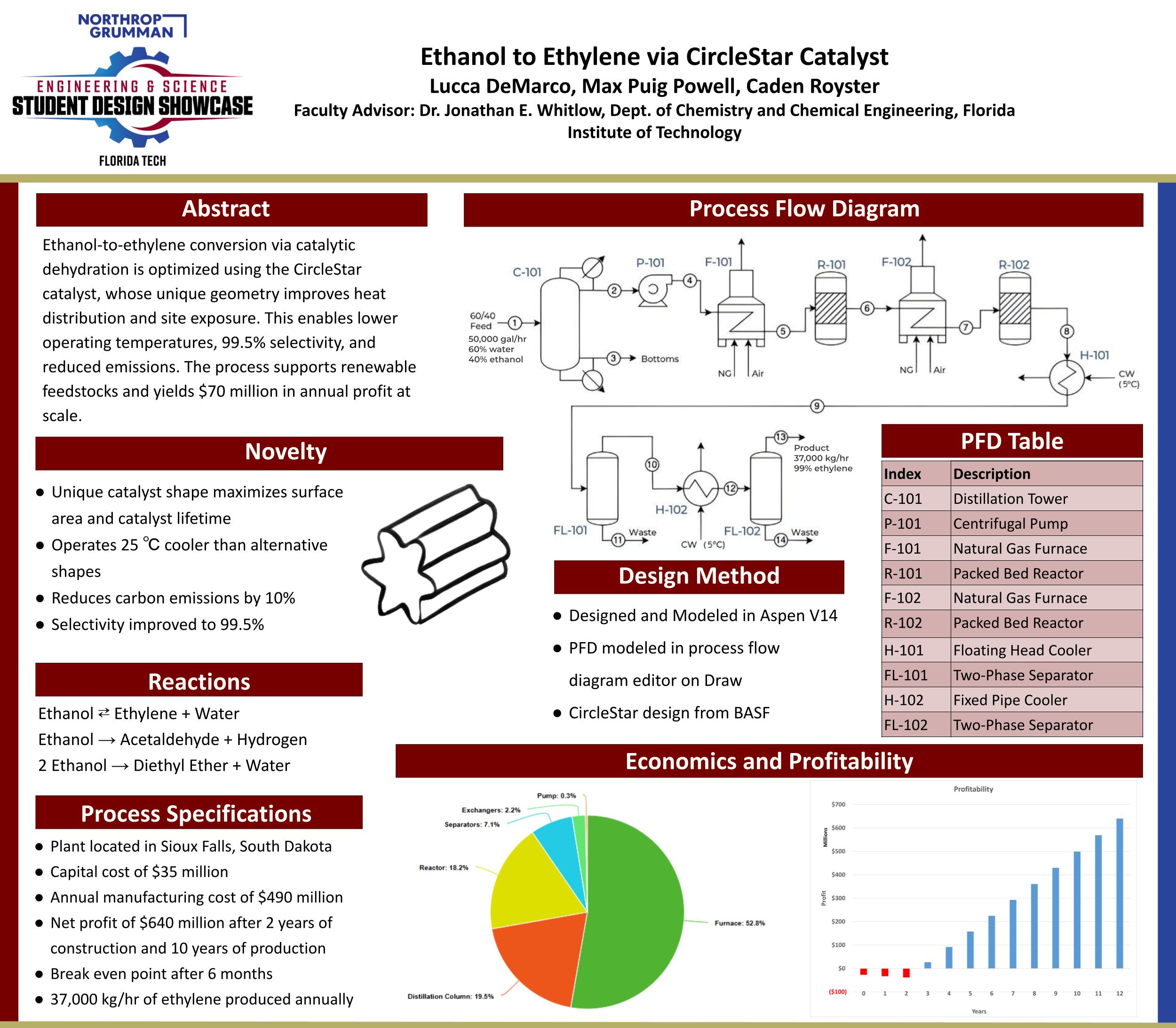 The final report presents a well-designed and innovative process for sustainable acetylene production by converting CO₂ emissions from flue gas into valuable products. Using Aspen Plus simulation and black-box modeling for complex reactions, the team effectively outlines process design, equipment sizing, and economic analysis. The plant demonstrates strong financial viability, breaking even in three years with a 52.1% IRR when capturing CO₂. The report also emphasizes environmental compliance, safety, and efficient resource recycling. While some assumptions, such as high recycling efficiencies and manual electrode replacement, may limit scalability, the overall design is both technically sound and economically promising.